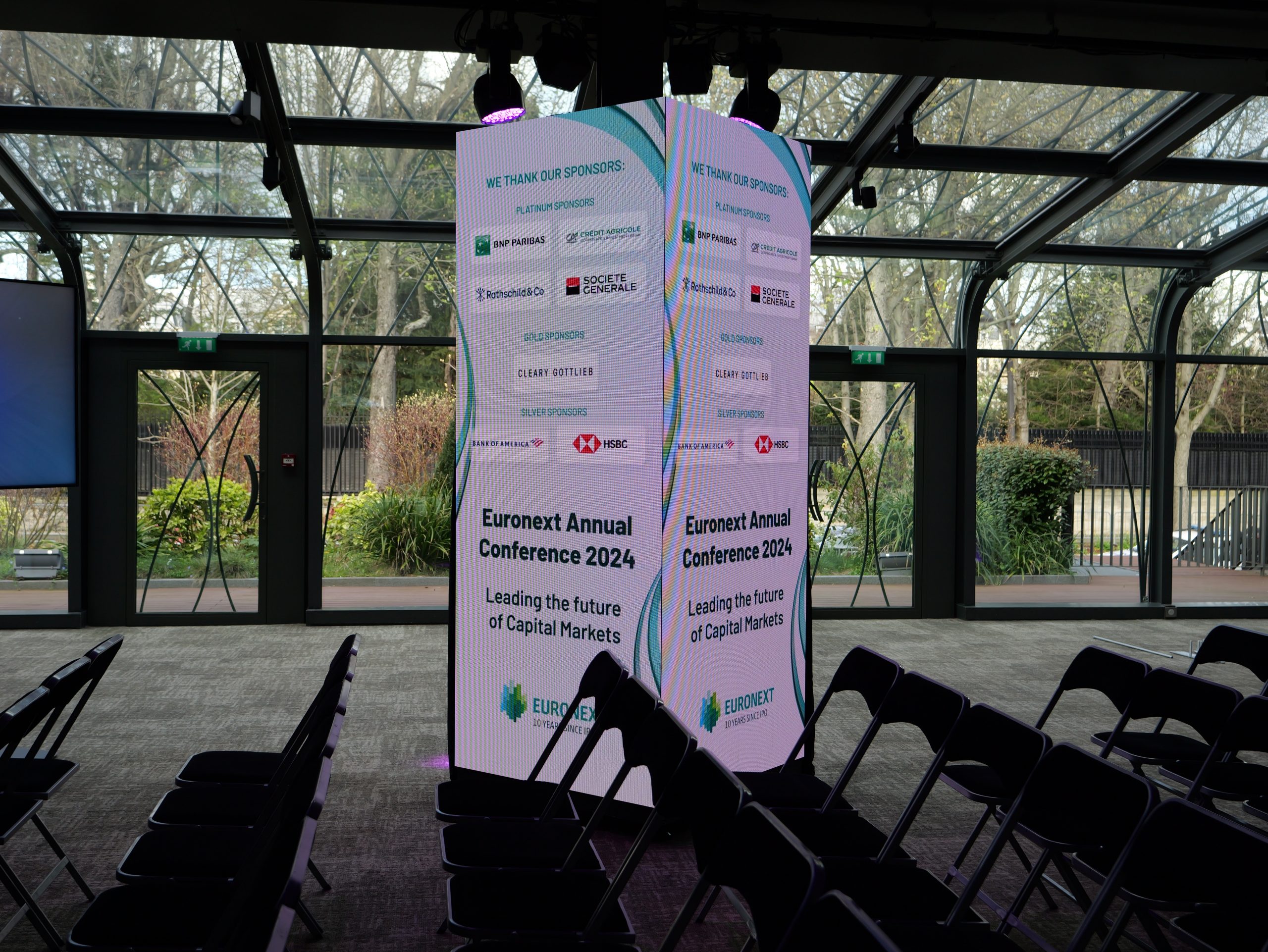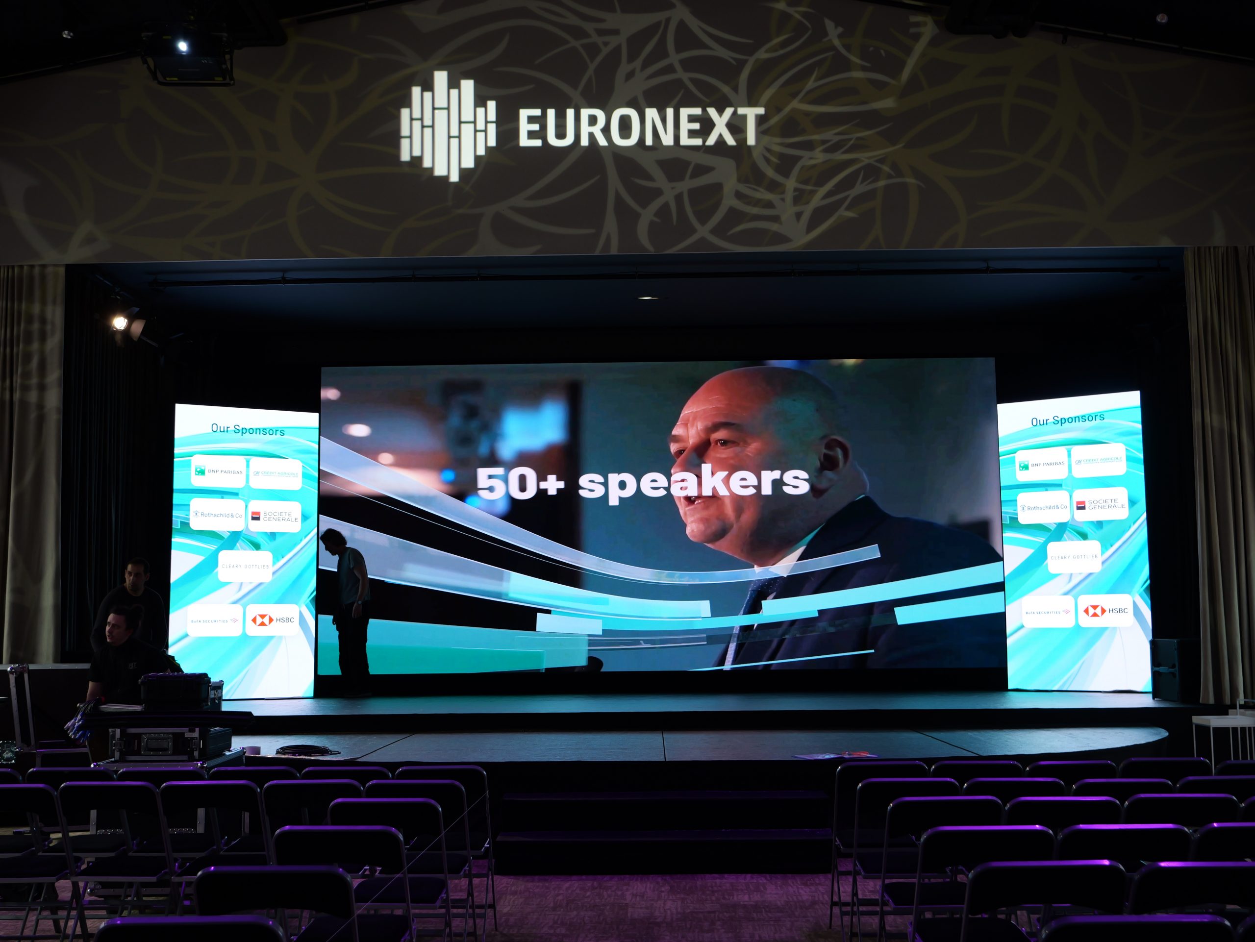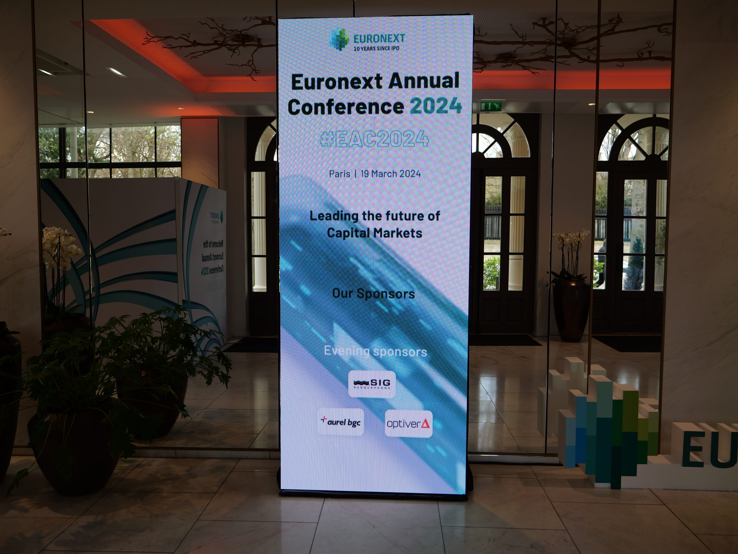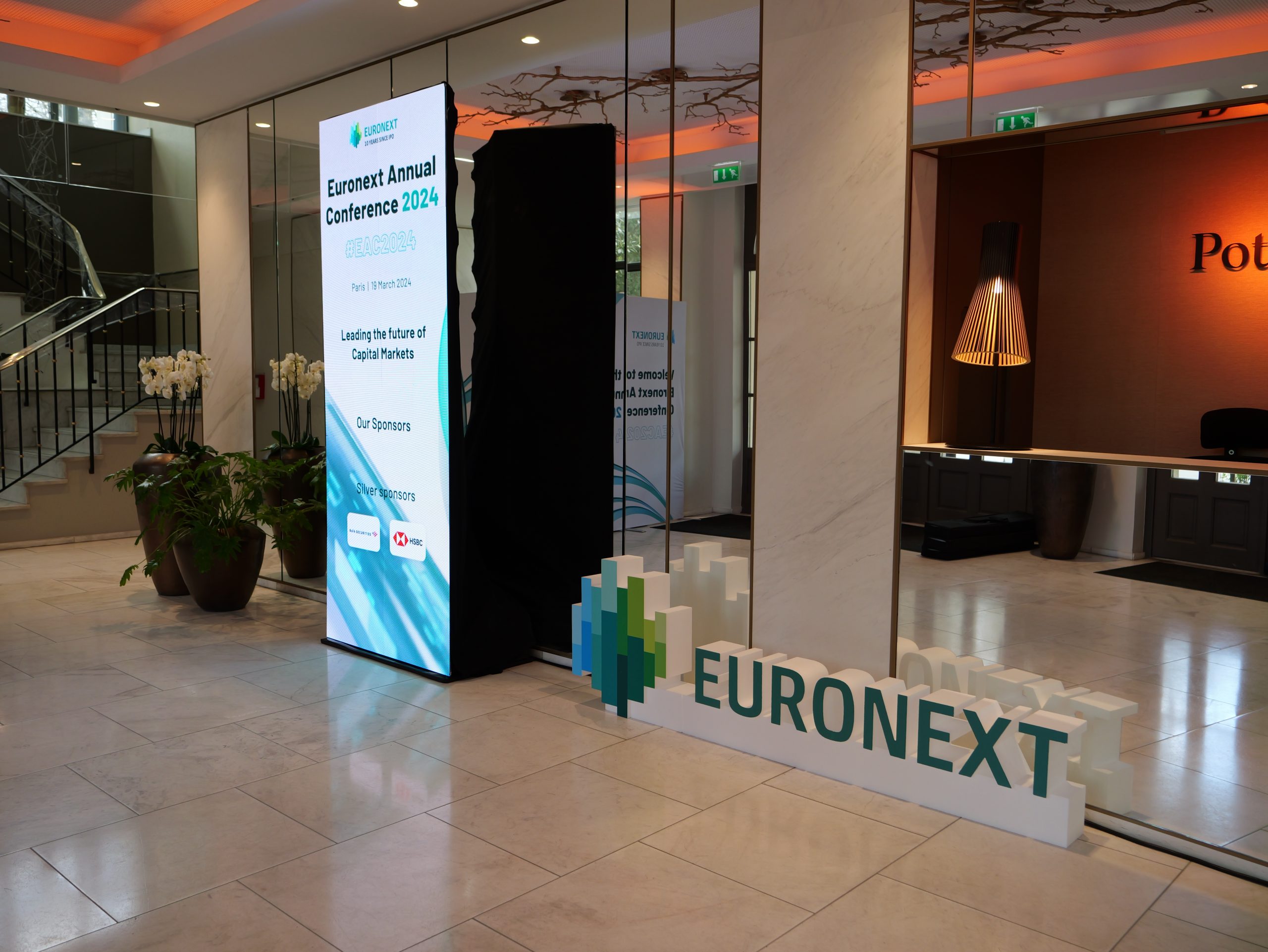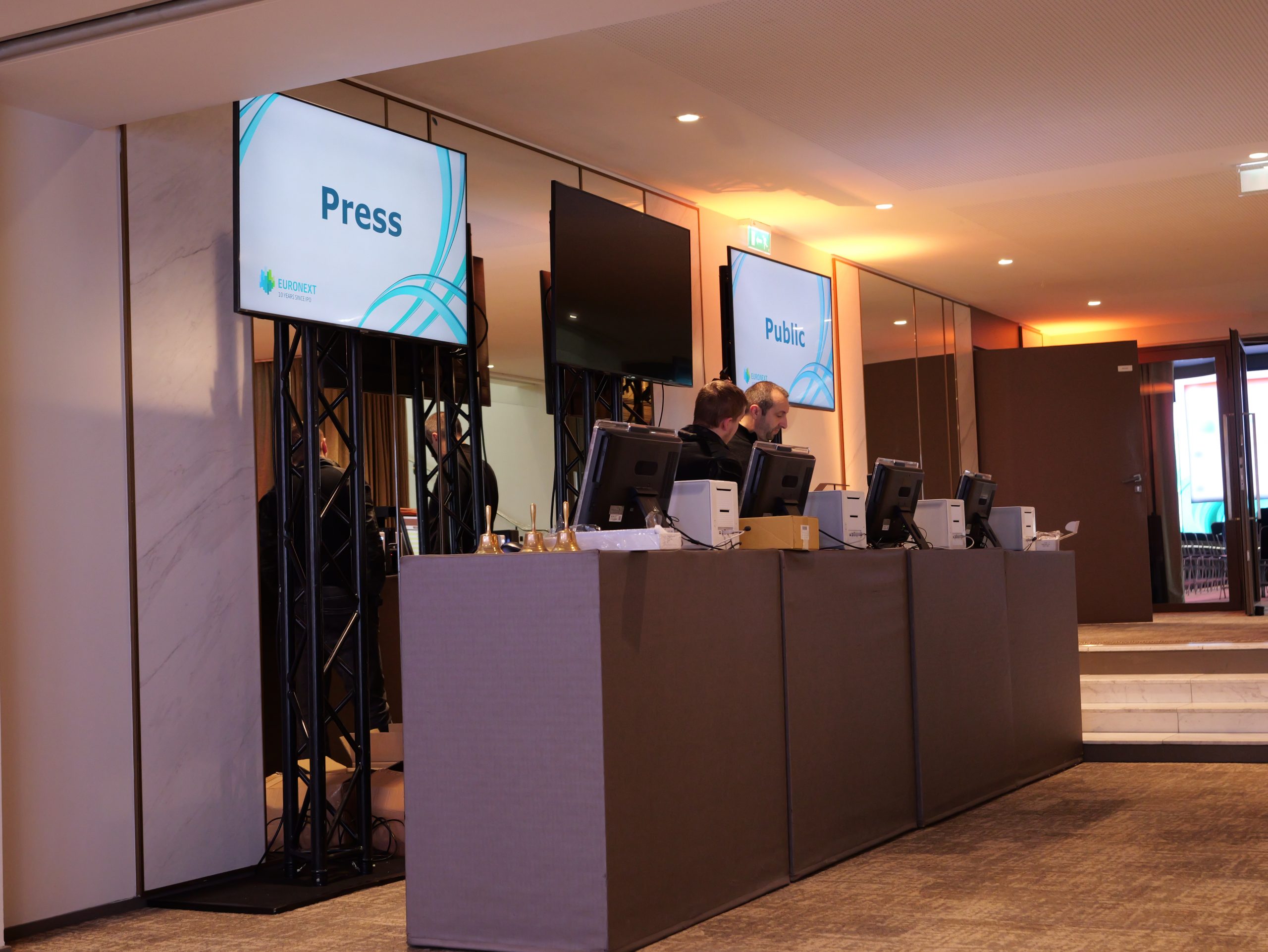 A l'occasion de la conférence annuelle d'Euronext, nous intervenons pour le compte de Synergie Production pour installer les supports vidéos à différents endroits stratégiques de l'événement.